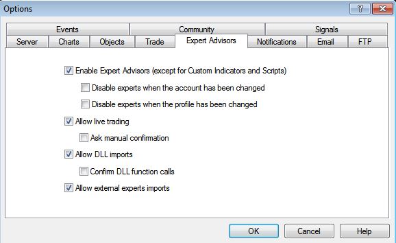 As a side note while in the Options box, you should make sure you are setup for EA trading. If you plan to run an EA, this is done in the Expert Advisors Tab.