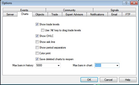 Again in the Options box (select Tools > Options) select the Charts Tab and reduce the Max Bars selection to 5000 (which is 17 days of 5 minute data). Click OK when done.