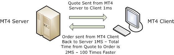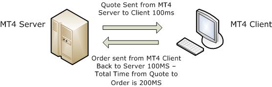 A trader using a common medium latency time of 100ms will take 100ms to get the price quote from the broker's MT4 server and then another 100ms to get the order sent back to the broker, resulting in a 200ms delay from the time the price quote is sent from the broker until the market order is received back at brokers server.